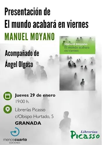 Menoscuarto Ediciones y Librerías Picasso se complacen en invitarles a la presentación del libro "El mundo acabará en viernes", de Manuel Moyano.