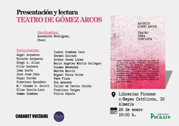 Un agradecimiento especial a la editorial Cabaret Voltaire por ayudarnos con la selección de textos, además de su colaboración y complicidad. También agradecemos a Ascensión Rodríguez, Choni, por su compromiso como coordinadora; a la Universidad Popular Celia Viñas y a todas las personas que nos acompañaréis en la lectura: Ángel Arqueros, Ricardo Arqueros, Diego A. Alías, Pilar Barberá, Inma Barón, Juan José Ceba, Paqui Cortés, Francisco Escudero, M.ª Carmen G. Galott, Elisa García-Lara, Gemma Giménez, Isabel Giménez Caro, Germán Guirado, Esther Jerez López, María Ángeles Martín Gallegos, Carmen Menéndez, Merche Murcia, Miguel Parra Uribe, Pepe Plaza, Eva Quereda, Taller de Teatro Jairán, Francisco Vargas, Gloria Zapata. Gracias a todos y todas por hacer posible este encuentro para recordar y reivindicar la figura de Gómez Arcos.
